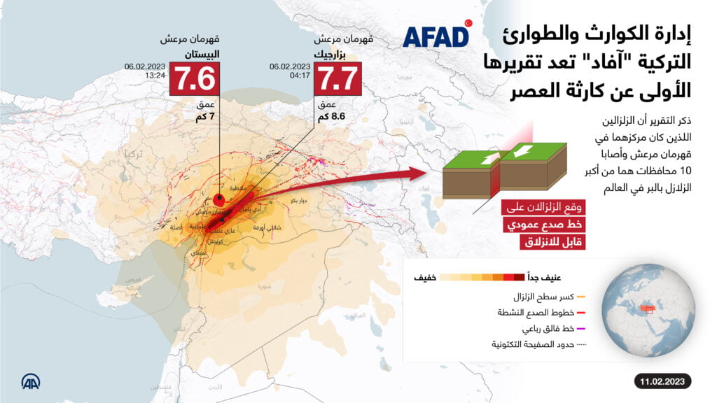وذكر تقرير “آفاد” أن الزلزالين اللذين كان مركزهما في كهرمان مرعش هما من أكبر الزلازل بالبر في العالم.