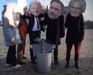 وارتدى الناشطون أقنعة تصور المستشار الألماني أولاف شولتس ووزراء في الحكومة، حاملين لافتات تندد بالصفقة التي تقدر قيمتها بـ 10 مليارات يورو (10.6 مليار دولار).