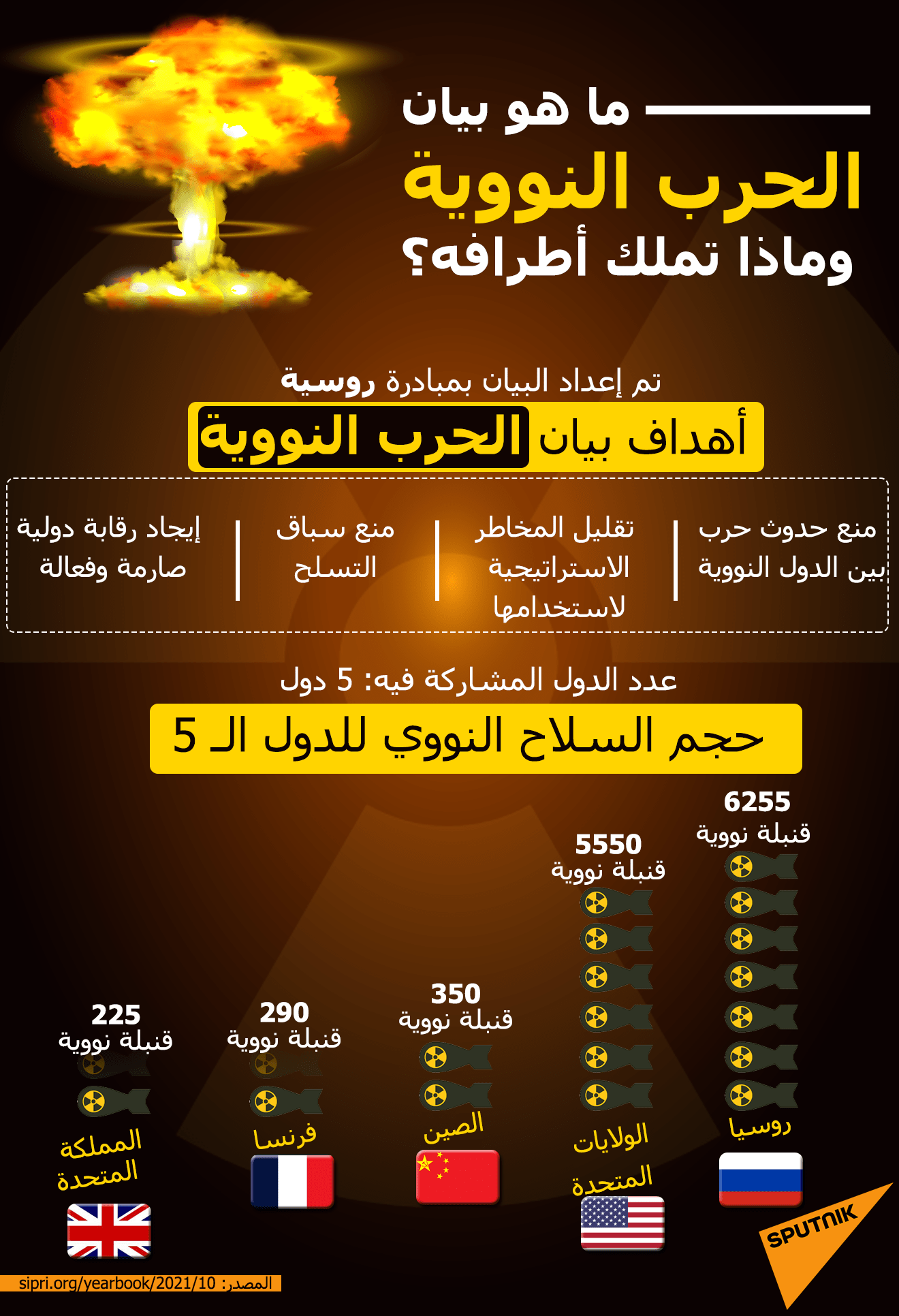 ورغم أن عدد الدول التي تمتلك أسلحة نووية في العالم هو 9 دول، إلا أنه لا يوجد سوى خمس دول فقط تعترف بامتلاكه وهي روسيا والولايات المتحدة الأمريكية والصين وبريطانيا وفرنسا، وهي الدول التي أصدرت البيان للتأكيد على مسؤوليتها تجاه منع حدوث حرب نووية.