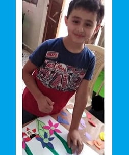 وينوّه بأنه “لم يتيع دورات فنية في مراكز أو معاهد. بل كان يرسم ويتدرب وبتعلم ويتطور في مرسمه بالبيت. ويحب الرسم بالألوان الخشبية لكن تتم تهيئته للرسم بألوان زيتية وإكرليك.. إنما الآن هو منشغل بتقوية خطه بتقنية الرصاص، وبات ينجز بورتريه بشكل جيد وصائب، ولديه رسمات لجده ووالده وأحبة في محيطه”.