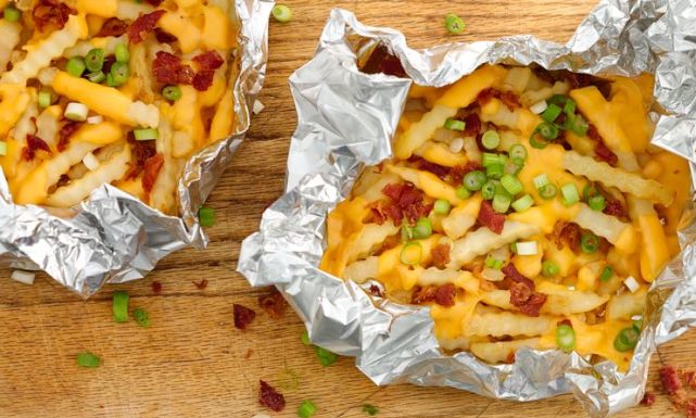 وزعي البطاطس في صينية الفرن المجهزة ثم اثني جميع جوانب ورق القصدير الأربعة.